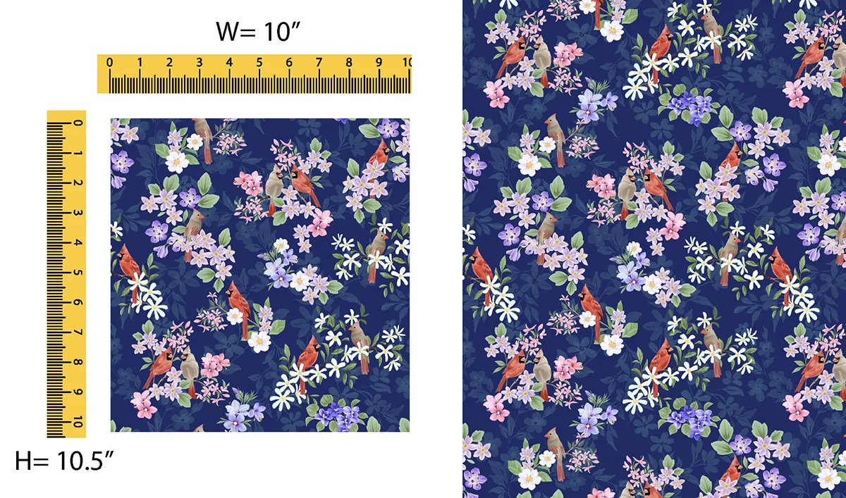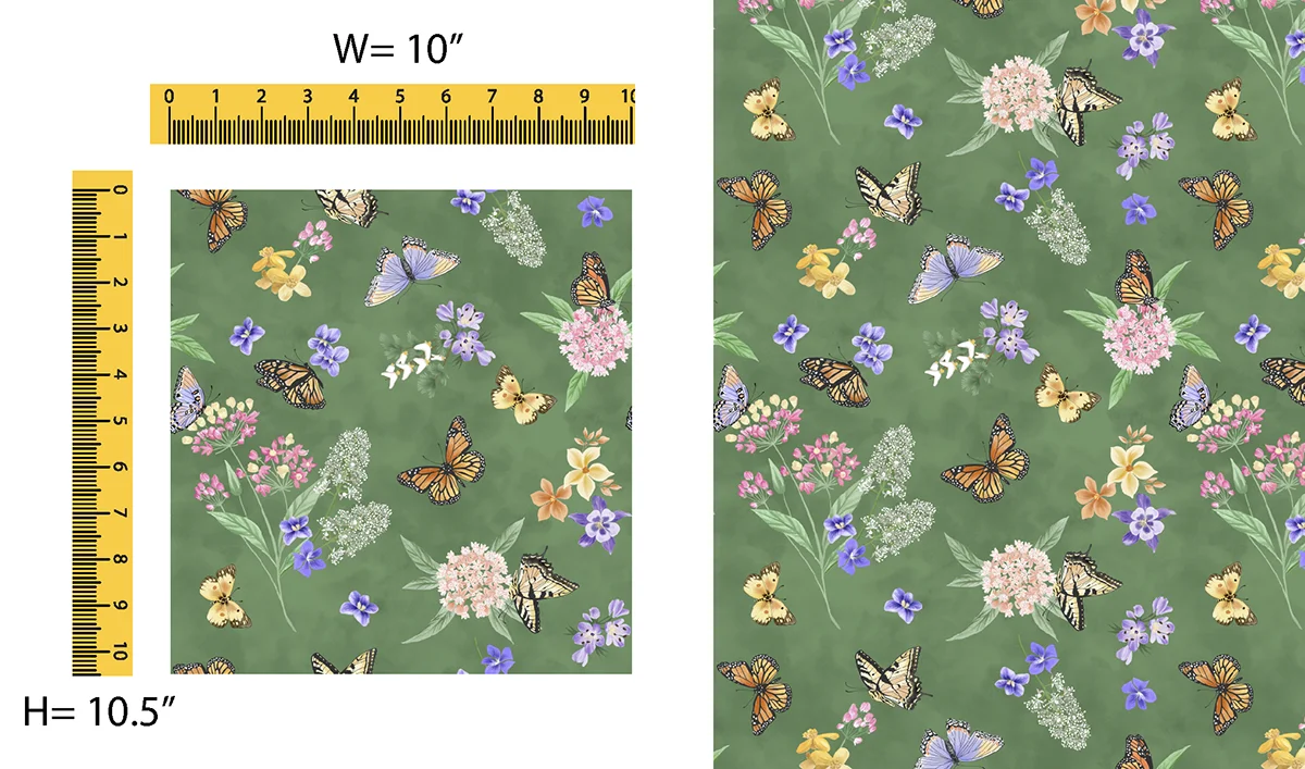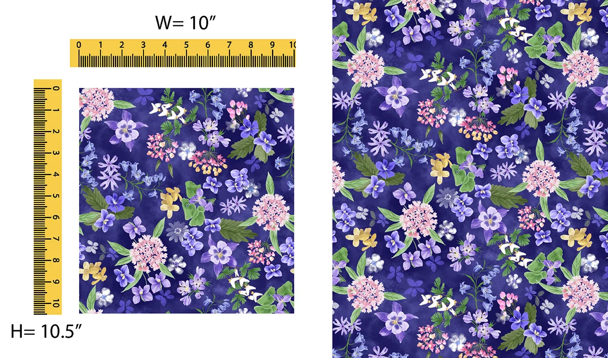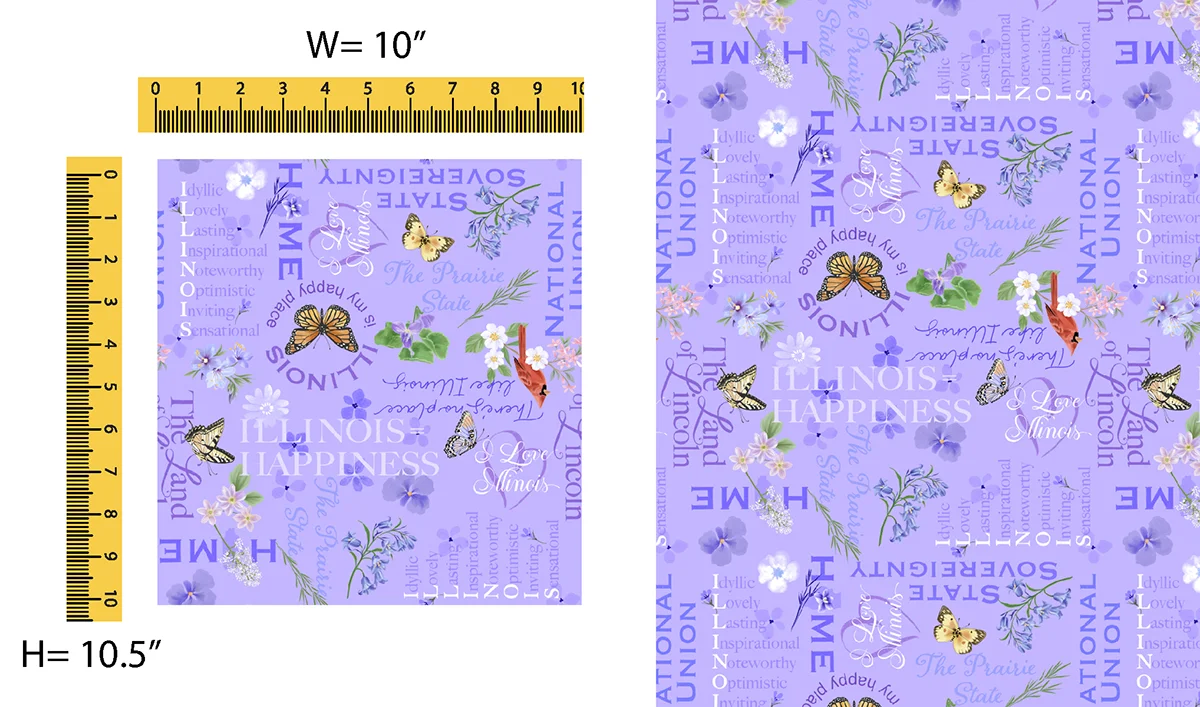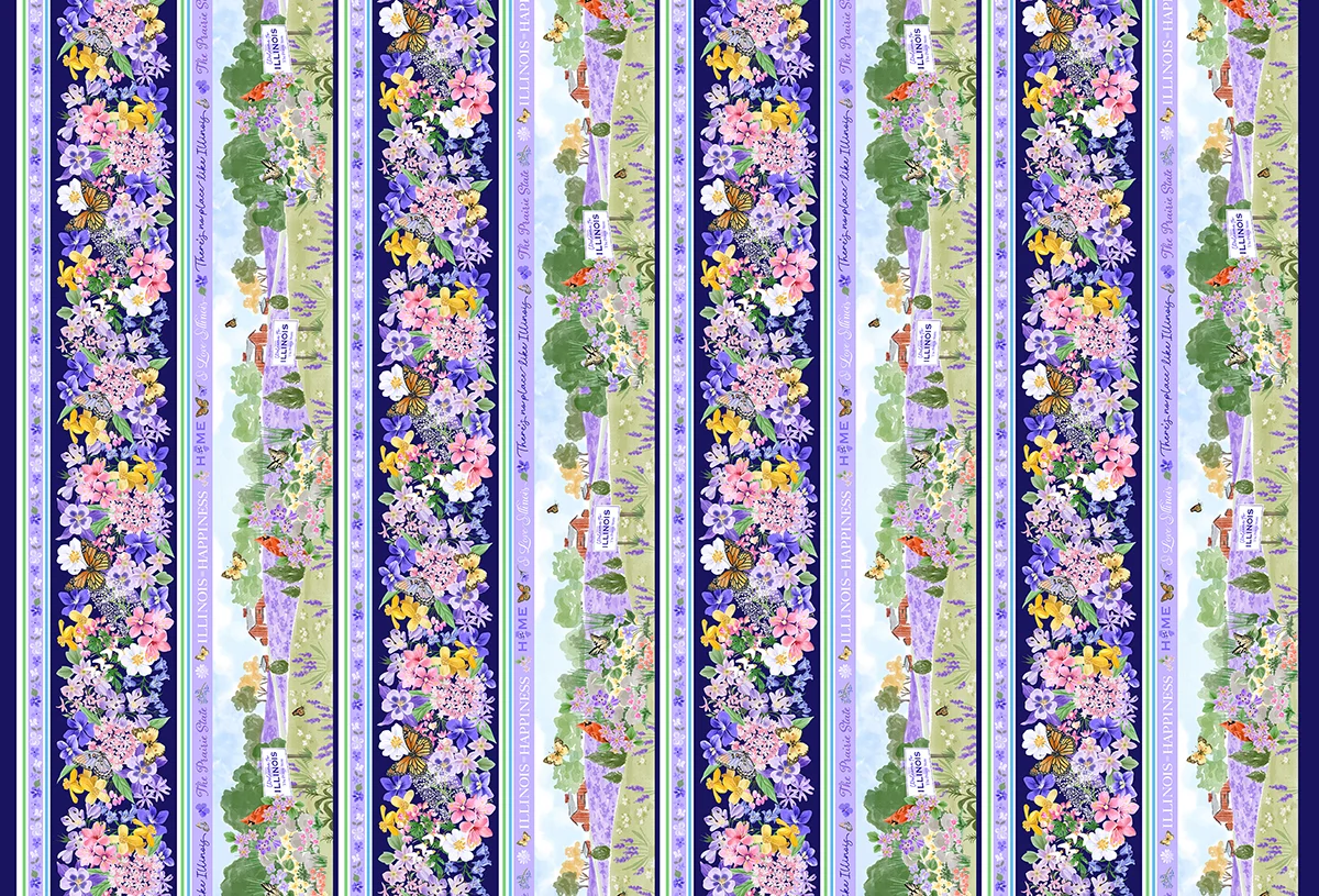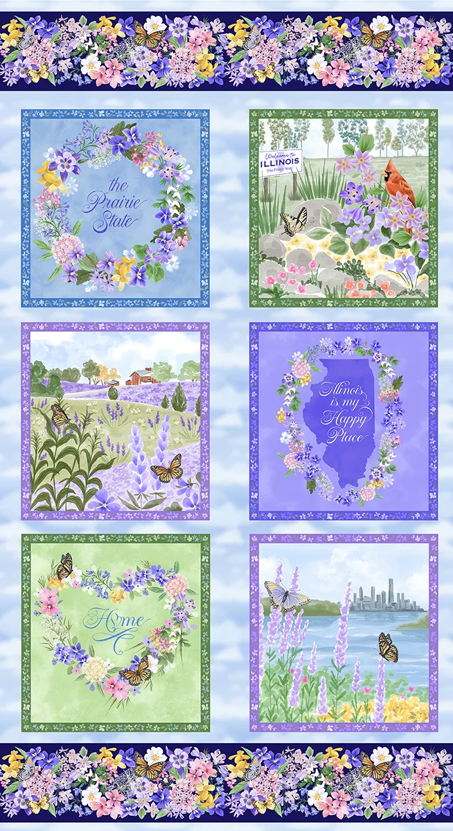 This year’s fabrics depict the “Prairie State” in beautiful florals. A large panel with six, 10-inch squares illustrations the Illinois prairie landscape. A stripe panel has two repeating 4-inch strips in floral and landscape themes. Complementing prints with color variations include butterflies, cardinals, an Illinois word and icon toss, flower petals, prairie flowers, prairie grass and violets. Ten solid blender fabrics round out the collection.